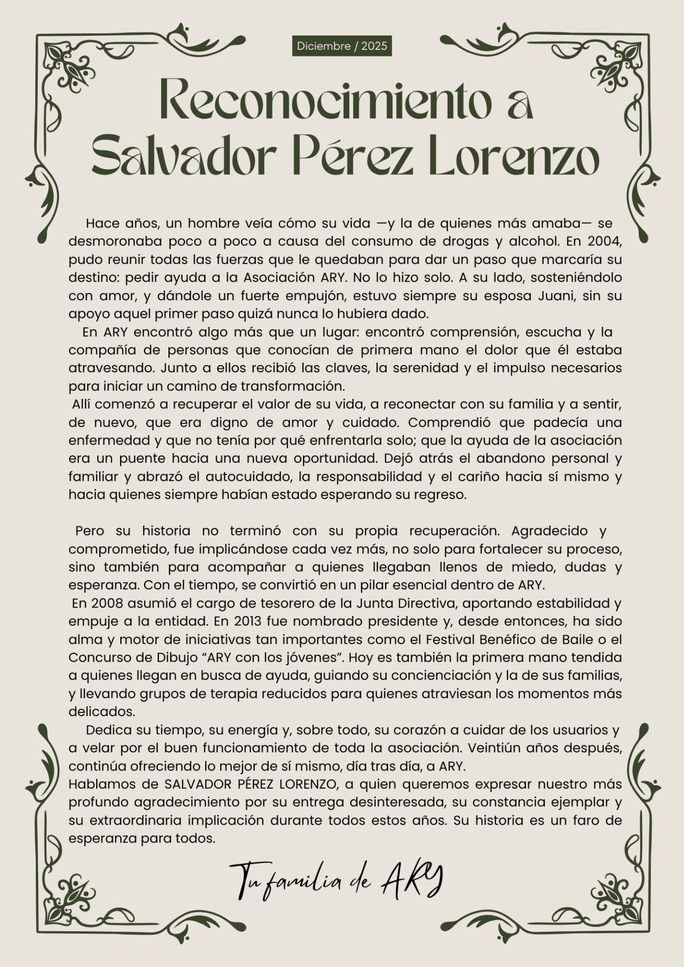 Ayer pudimos disfrutar de un acto muy emotivo en el que se reconocía la figura del voluntariado y su importancia como labor social. Uno de los reconocidos fue nuestro presidente, Salvador, por su trayectoria e implicación con la Asociación ARY y con sus usuarios durante tantos años.